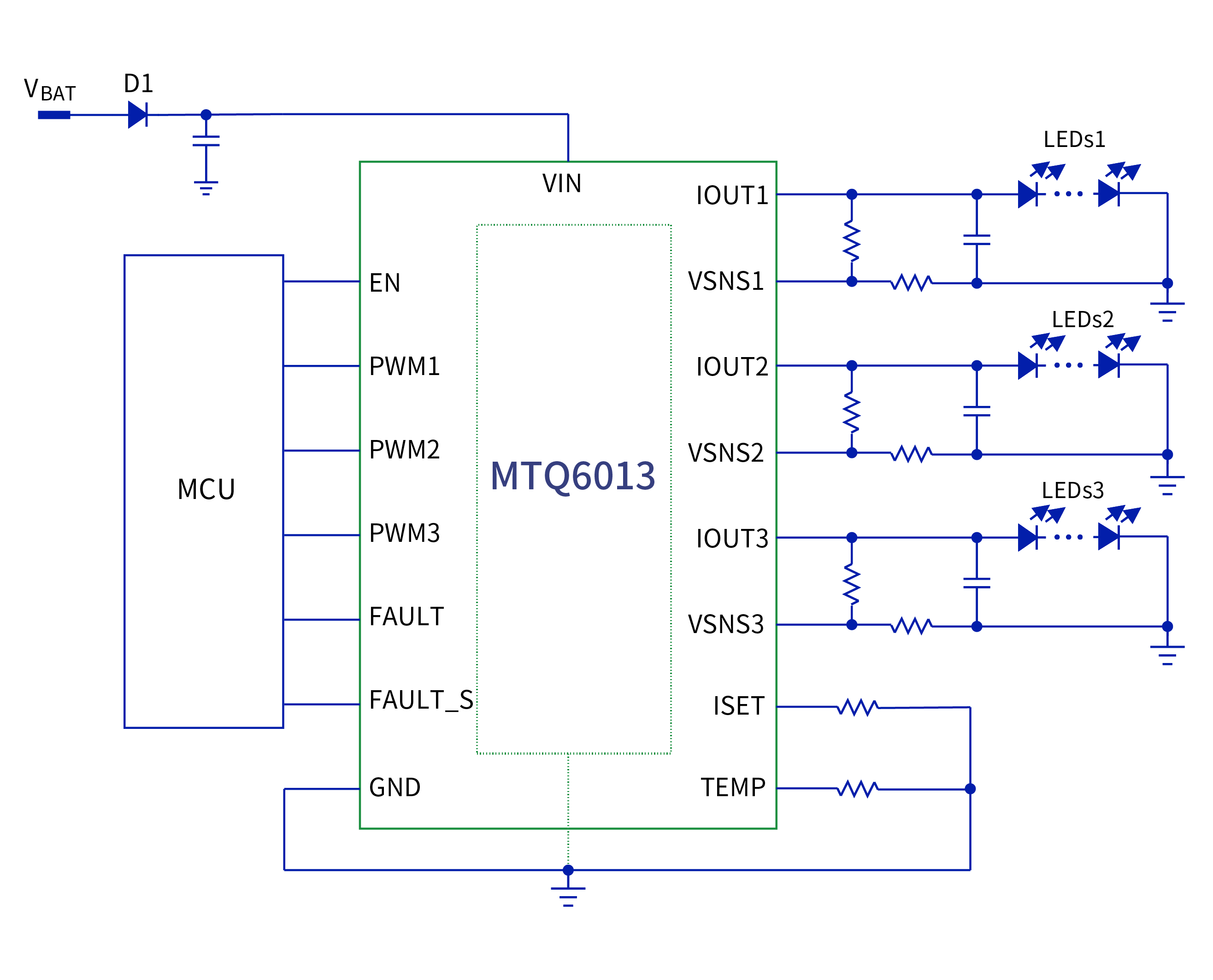 MTQ6013提供完整的诊断功能以满足汽车级需求,拥有单颗LED短路故障报错的FAULT_S引脚和用于报告开路、短路和热关断故障的FAULT引脚,双故障引脚可满足各种要求和应用条件的故障诊断需求,确保系统可靠稳定地工作。
