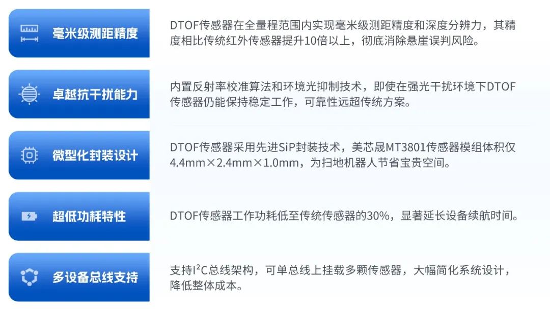 相较于传统红外和超声波传感器,DTOF(直接飞行时间)传感器带来了显著的性能跃升,为扫地机器人提供了卓越的环境感知与避障能力,解决了长期困扰扫地机器人行业的痛点问题。