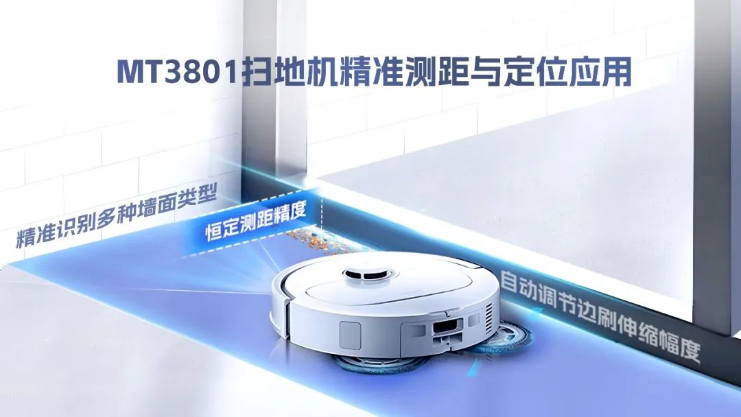 DTOF传感器在沿墙模式下保持恒定测距精度,确保边刷与墙面始终维持最佳间距,实现极限贴边。同时,基于实时距离反馈,系统自动调节边刷伸缩幅度,将墙角垃圾精准扫入主吸尘通道,还可精准识别多种墙面类型(如踢脚线、玻璃幕墙、凹凸砖墙等),并自动调整清洁策略。(点击查看更多MT3801产品信息)