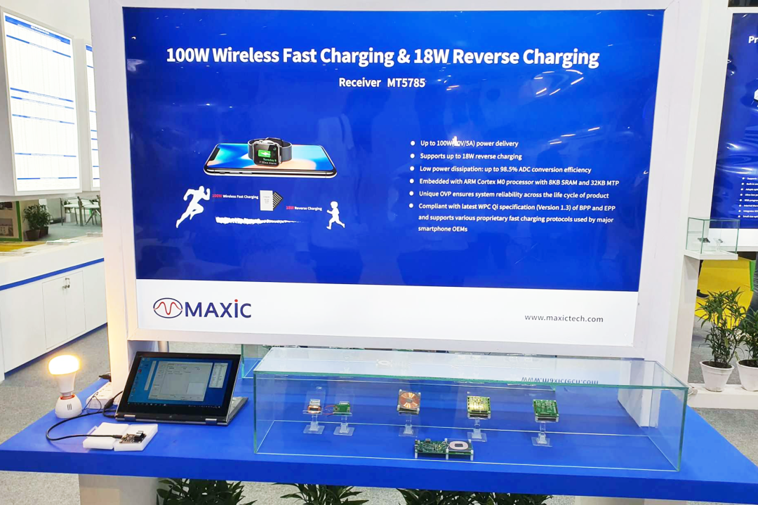 无线充电展区 重点展示了可支持100W无线快充和18W反向充电的MT5785及其接收端系列产品、集成USB-PD协议的一芯双充Tx芯片MT5815及其发射端系列产品,展会体验区吸引了大批客户参观与咨询,共同探讨交流无线充电前沿技术。