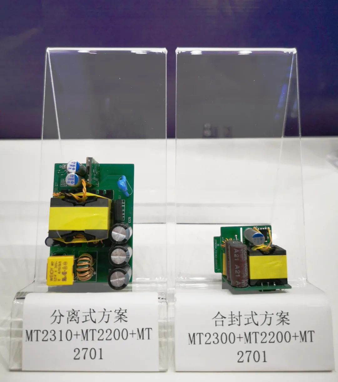 有线快充则带来了20W-65W的整体解决方案,该方案分为分离和合封两种,分离式方案可以让客户自由选择合适的器件,最大化地发挥其自身Si MOS或GaN功率管供应链优势;而合封式方案,则有利于产品的小型化。