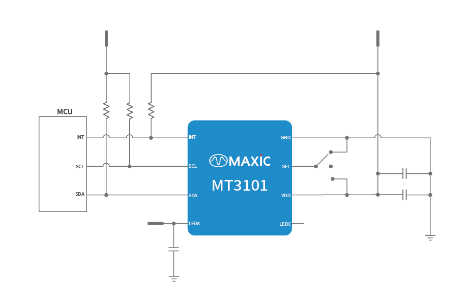 MT3101接近检测传感器内置数模相结合的智能串扰消除技术,能够最大程度地增大信号可用的动态范围,提高抗串扰能力,采用高环境光抑制设计,搭配高效算法技术,提升红外线测量数据转化为接近检测结果的精度,降低误差值。内置9-12 bits ADC用于接近检测输出,可编程驱动电流输出最大到16mA且脉冲宽度和个数可配置。I²C 通信接口频率最高可达400kHz,且支持3种不同的 I²C 识别地址,3颗MT3101可使用同一条 I²C 总线,降低多器件系统电路的设计难度。