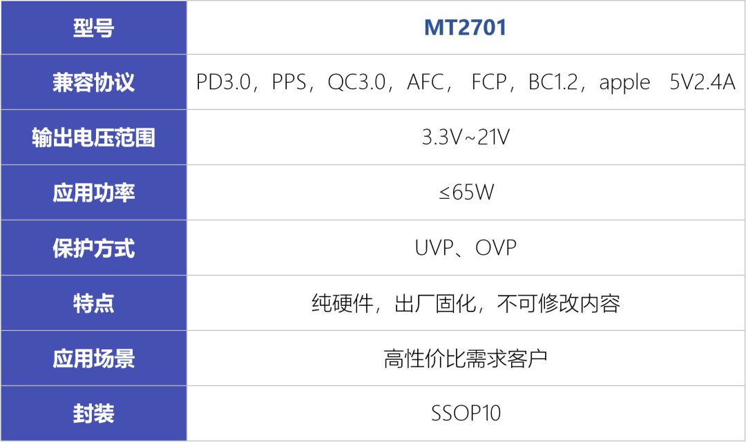 美芯晟开发的快充协议芯片包括MT2701和最新的MT280X系列,芯片兼容多种快充协议。MT2701支持65W以内应用,兼容PD3.0,PPS,QC2,QC3,AFC,FCP,私有协议低压直充5V4.5A,Apple 5V2.4A,BC1.2等常用协议。MT2701采用纯硬件架构,通过外部元件来调节输出功率段,应用简单,BOM成本低,适合不需要USB-IF认证的客户。