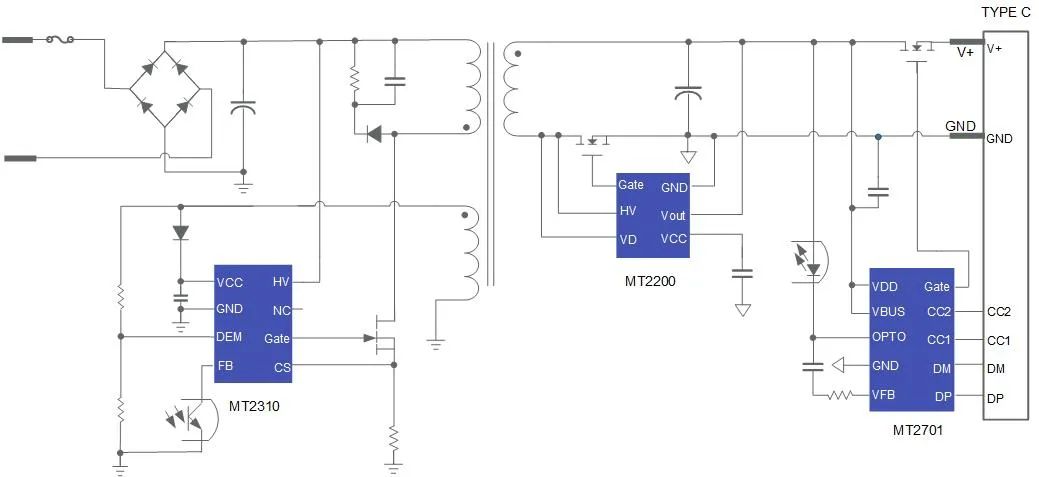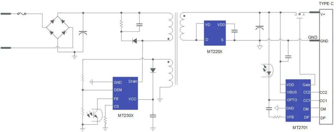 65W以内合封 Si MOS/GaN功率管整体方案典型应用如上图所示。配套使用的快充协议芯片是兼容多协议的MT2701,合封式方案利于客户将产品小型化。