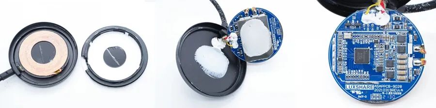 首先沿无线充外壳接缝撬开外壳,铝合金外壳内部是无线充驱动电路以及线圈,白色面板固定在塑料支架上,与铝合金外壳之间通过卡扣固定。电路板背面焊接屏蔽罩,屏蔽罩使用胶水固定在无线充电器外壳内部。无线充内置一块圆形电路板,上方焊接输入USB-C导线,右侧焊接无线充电线圈,下方为指示灯焊盘,预留有指示灯的位置。