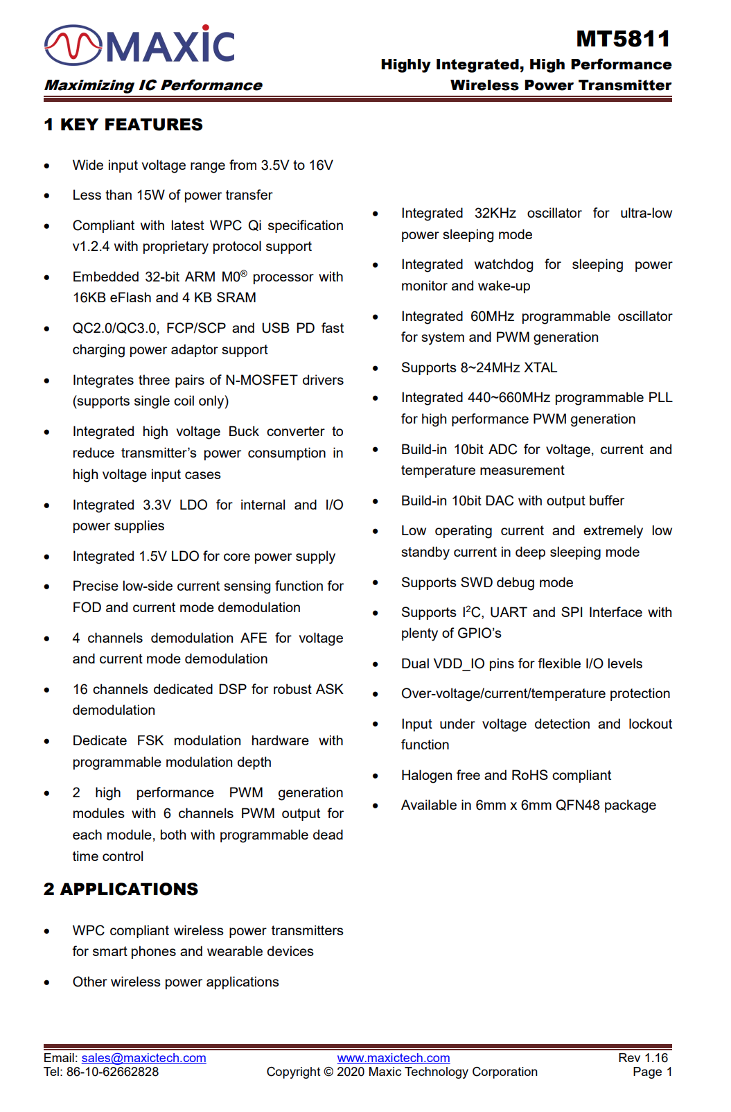 无线充电主控芯片采用美芯晟MT5811,这是一颗高度集成的无线充电SoC,支持3.5-16V宽范围供电,支持小于15W的无线充电应用,芯片符合WPC Qi 1.2.4规范,并支持私有充电协议,芯片内部集成32位M0处理器,16KB eFlash和4KB SRAM。