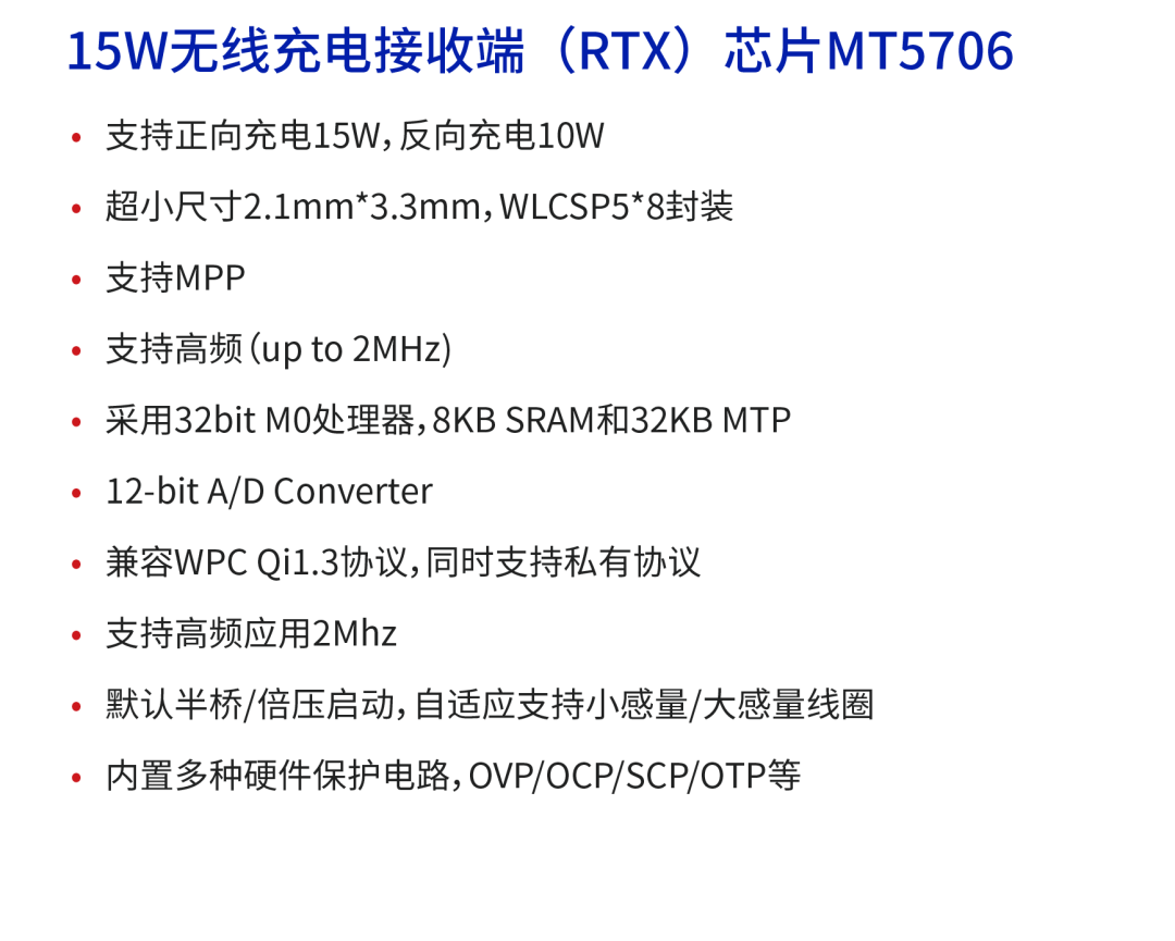 美芯晟推出的MT5706+MT5805是一套高性价比无线充电15W All-in-One RTX/TX解决方案,兼容WPC Qi 1.3协议,在减小芯片尺寸的同时满足市场 EPP 15W的功率需求,支持高精度Q值检测,内置多种硬件保护电路,在降低芯片成本的同时,支持小感量线圈无线充电、高频无线充电等技术,使终端产品获得更快的充电速度,满足客户多样化的定制需求。