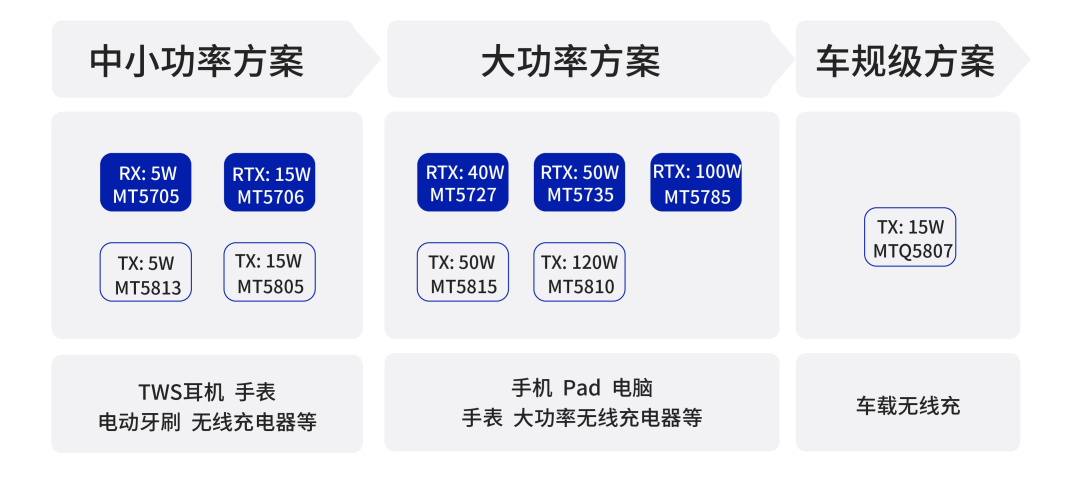 该方案可应用于手机、PAD、可穿戴设备、智能配件、电动牙刷、移动电源、车载支架等中小功率消费电子产品。MT5706+MT5805方案输出功率可达15W。