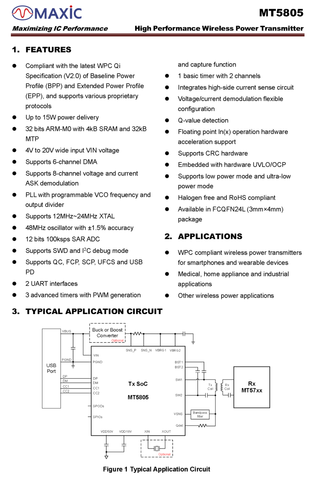 MT5805 offers various protections, including over-voltage protection (OVP), over-current protection (OCP), under-voltage protection (UVP), and over-temperature protection (OTP). It also integrates dynamic power limiting with adjustable power output. Packaged in FCQFN3×4-24L, MT5805 is suitable for wireless charging transmitters in smartphones, wearables, medical devices, home appliances, and industrial equipment.