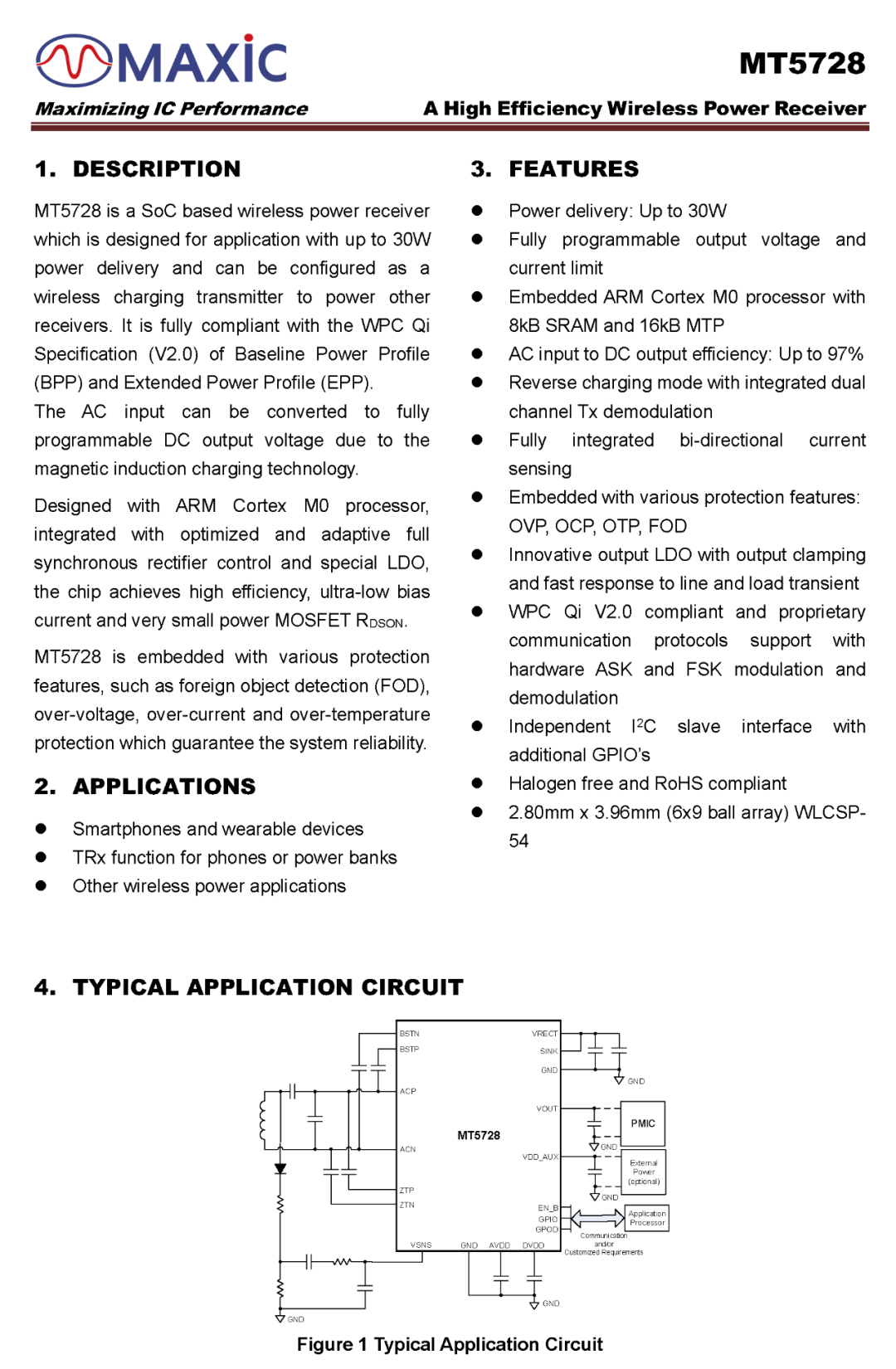 MT5728 offers various protections, including OVP, OCP, OTP. It supports I²C and configurable GPIO interfaces and is packaged in WLCSP54, suitable for wireless charging applications in smartphones, power banks, tablets, and other electronic devices.