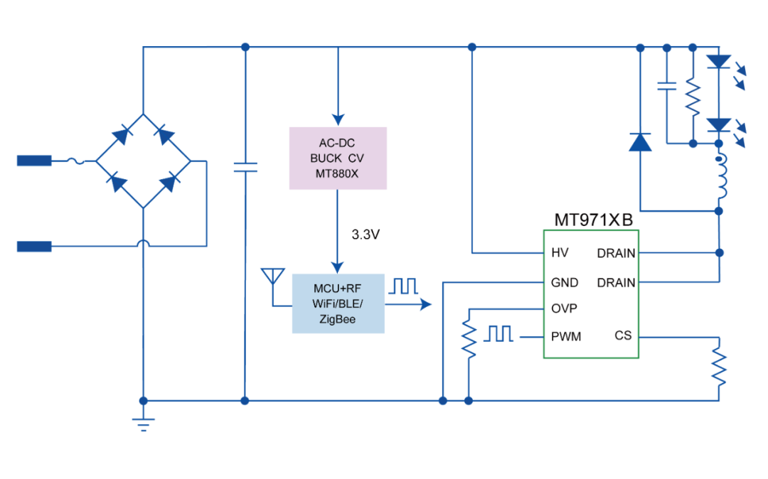 A new member of LED dimming series, MT971XB, is launched. It is a series of full range analog dimming, non-isolated, BUCK, constant current LED driver. With self-developed technologies, the chip gets 0.1% dimming resolution, full range flicker-free reliable OVP, ultra-low power consumption (<40mW@265Vac), significantly improving the performance of smart lights, bringing users an ultimate experience.